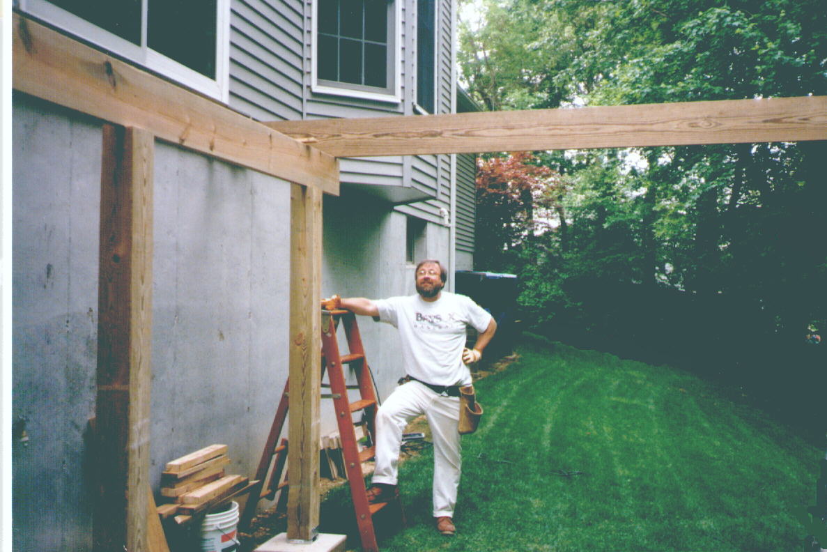 This is me in the middle of building a sundeck off the living room of our house in Bowie, Maryland, USA. (Click HERE to see a pic of the finished structure and patio!)